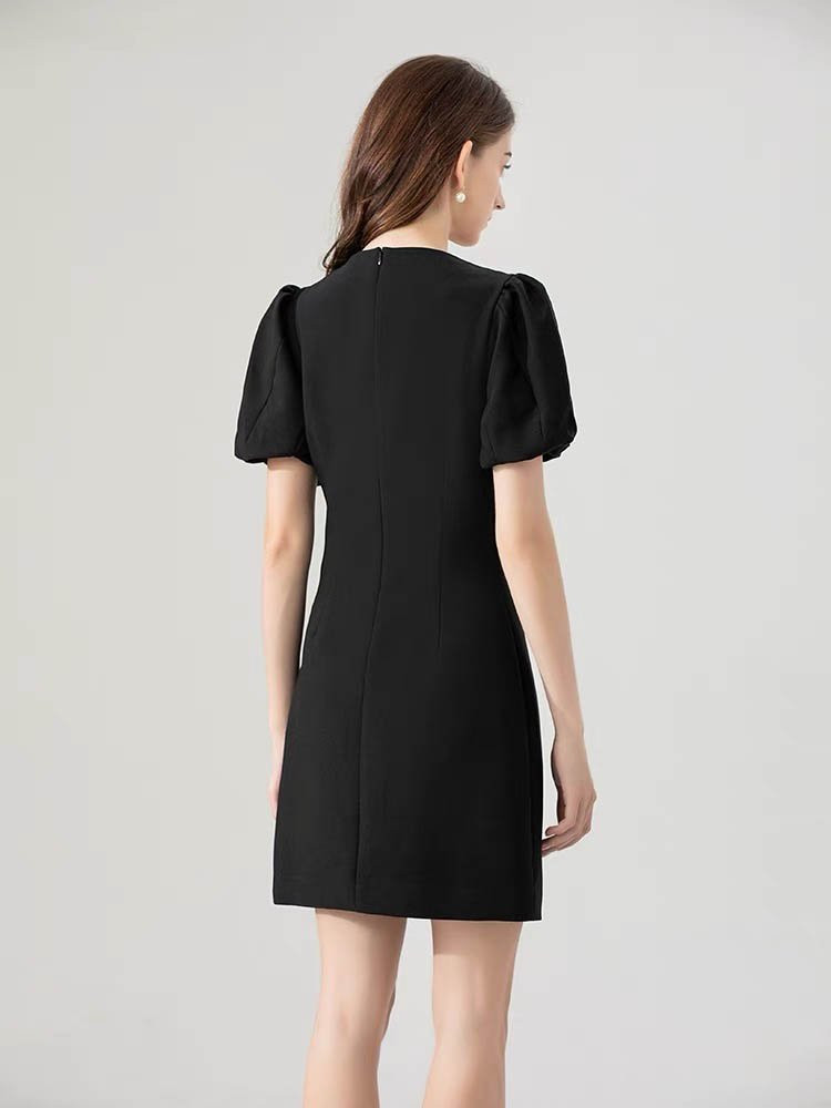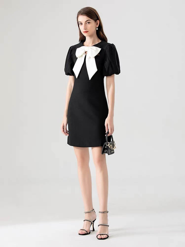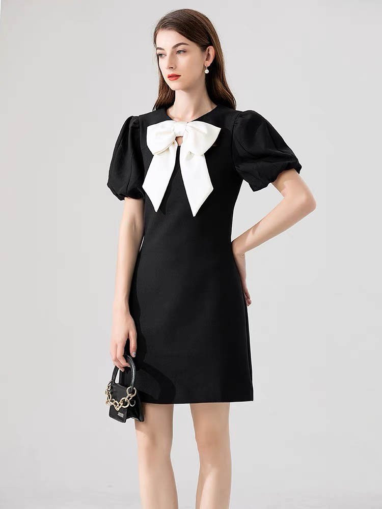 Điểm nhấn đặc biệt của chiếc váy là chi tiết nơ trắng được phối cùng tông màu đen tinh tế. Váy dáng A eo sẽ khéo léo tôn lên dáng của nàng.