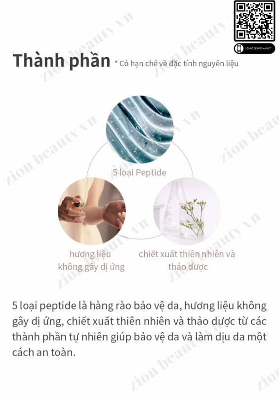 Thành phần: 5 loại peptide là hàng rào bảo vệ da,thương hiệu không gây kích ứng, chiết xuất thành phần thiên nhiên và thảo dược giúp làm dịu da một cách an toàn