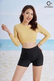 Bikini 2 mảnh áo croptop caro dài tay quần đùi - vàng 22041