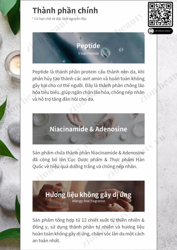 Thành phần: 5 loại peptide là hàng rào bảo vệ da,thương hiệu không gây kích ứng, chiết xuất thành phần thiên nhiên và thảo dược giúp làm dịu da một cách an toàn